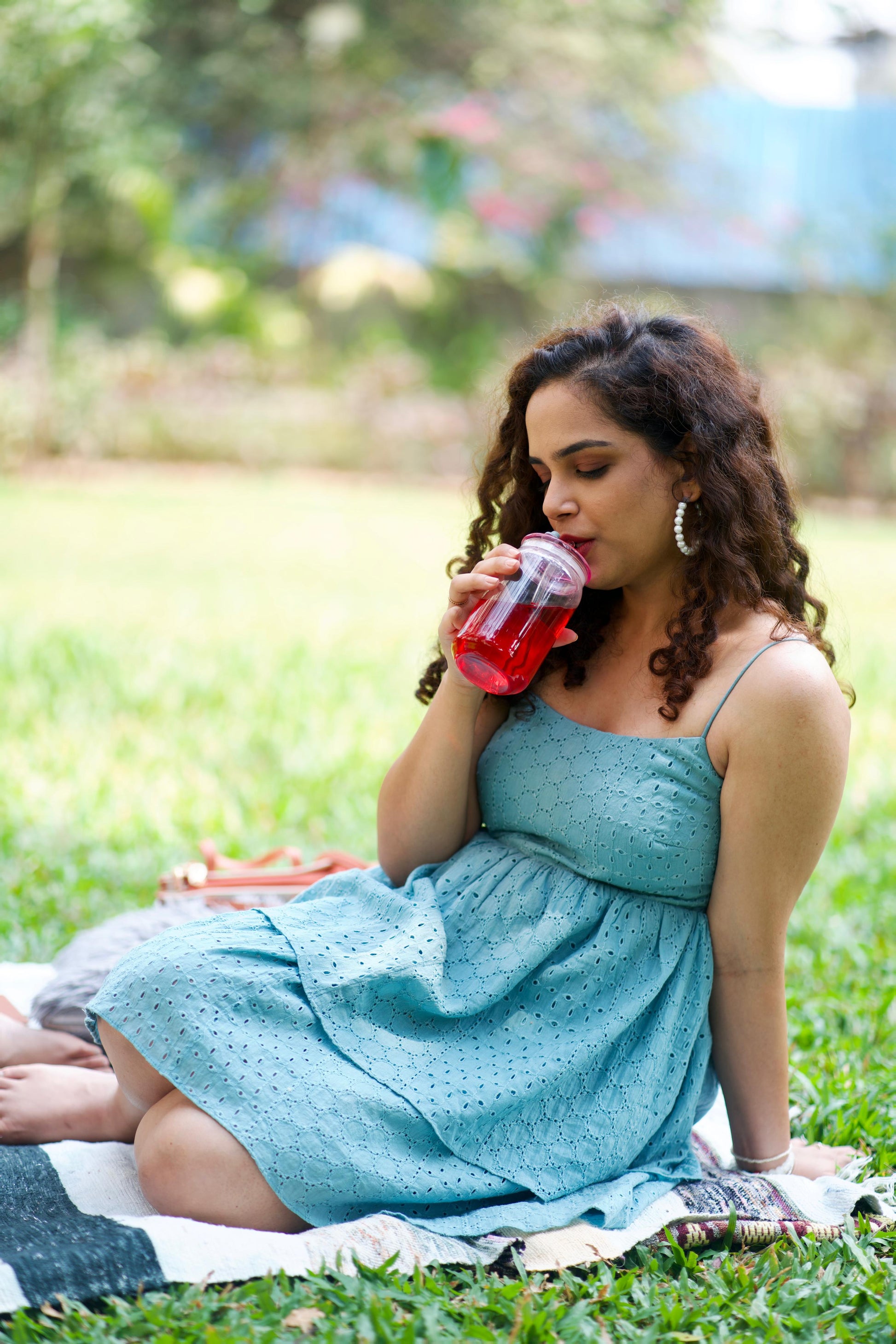 A charming blue cotton schiffli dress featuring delicate spaghetti straps and a flattering fit-and-flare silhouette. Designed with a back zip closure and playful two-layer ruffles, it's the perfect choice for picnics and dreamy vacation outings