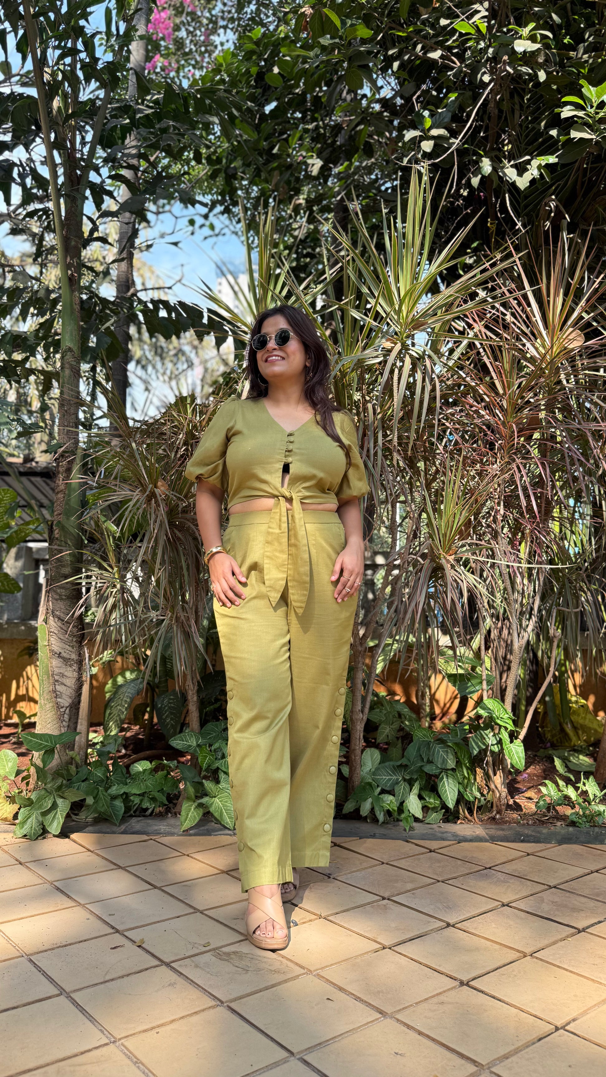 A chic short top featuring front buttons and a tie knot detail, complemented by puff sleeves. Paired with pants that have stylish side buttons at the bottoms for a touch of flair.